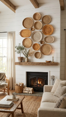 A curated gallery of woven wall baskets arranged above the mantle creates beautiful texture and warmth.