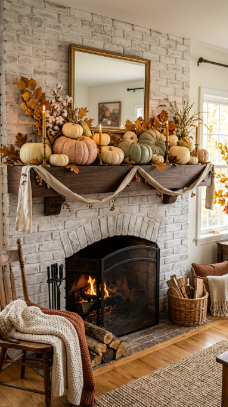 A charming autumn mantle with heirloom pumpkins, gourds, and dried leaves is cozy farmhouse fall perfection.