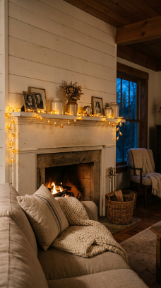 Warm fairy lights draped softly along the mantle shelf create the coziest farmhouse evening glow.