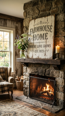 A large chippy-paint vintage wooden sign with a simple word or phrase leaning on the mantle is full of farmhouse personality.