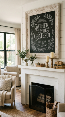 An oversized framed chalkboard above the fireplace for seasonal messages is both practical and charming.