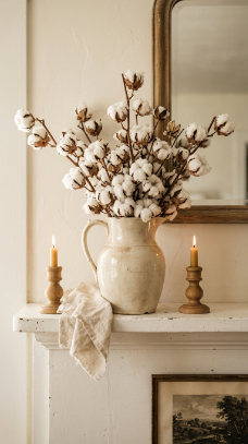 A generous bunch of dried cotton stems arranged in a vintage ironstone pitcher is purely and perfectly farmhouse.