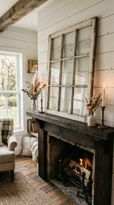 A weathered multi-pane vintage window frame resting on the mantle is a beautiful architectural farmhouse accent.