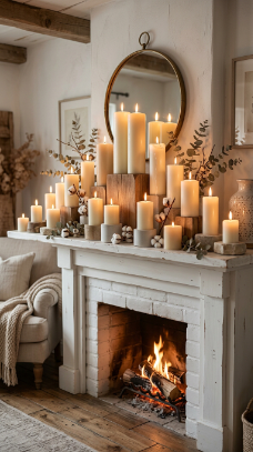 A clean white shiplap mantle styled with a row of pillar candles at varying heights is classically farmhouse perfect.