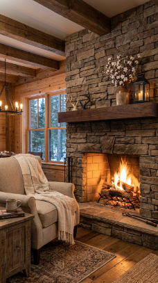 A stone fireplace mantle with subtle antler accents brings a refined lodge-meets-farmhouse energy.