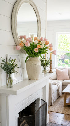 A loose, overflowing tulip arrangement in a tall aged vase brings the freshest farmhouse spring energy to the mantle.