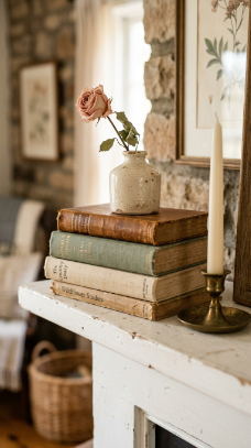 A curated stack of aged books topped with a small ceramic figure or vase creates an intimate mantle vignette.