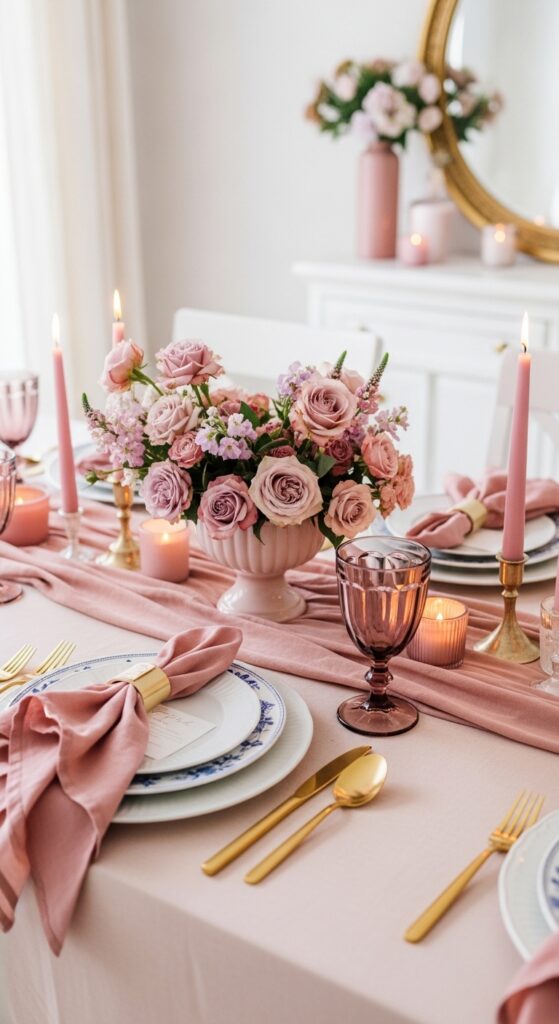 How to achieve it: Mix one warm blush, one muted rose, and one deeper mauve instead of matching everything exactly. Anchor the palette with ivory plates or a neutral tablecloth so the pinks feel elegant rather than sugary.