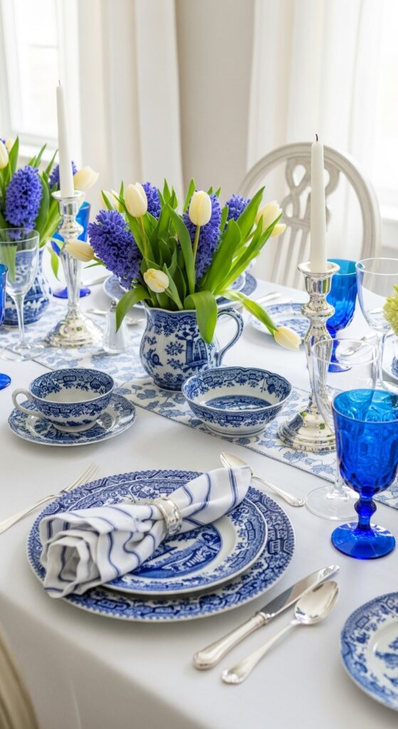 What makes it work: Blue-and-white porcelain adds pattern without visual clutter because the palette stays tight. It also pairs beautifully with spring florals, especially tulips and hyacinths, which soften the crispness of the china.