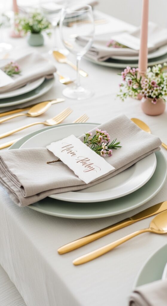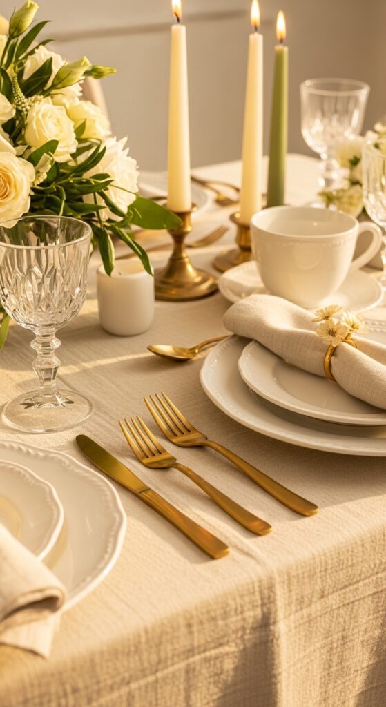 What makes it work: Warm metallics bring light to a neutral table. Brushed gold works especially well with ivory, cream, and flax because it adds contrast while staying softer than mirror-finish silver.