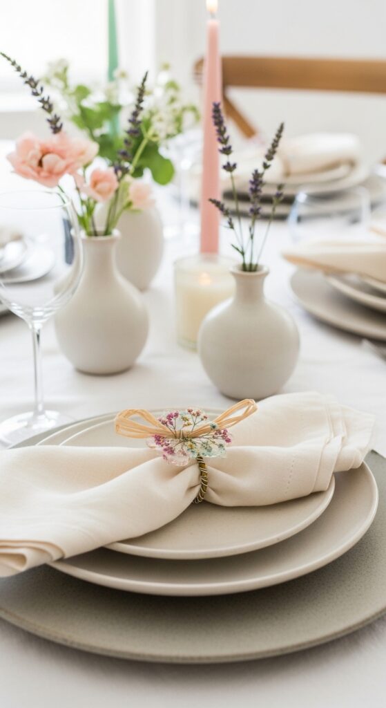 How to achieve it: Use resin floral rings, twisted raffia loops, or plain brass rings with tiny dried flowers wired on. Soft linen napkins in ivory, petal pink, or pale lavender make the floral detail stand out more clearly.