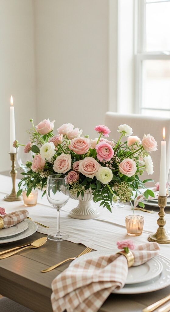 How to achieve it: Use narrow bud vases tucked close together instead of one bulky arrangement. Choose blush peonies or garden roses with eucalyptus, and keep the floral band to the middle third of the table for better proportion.