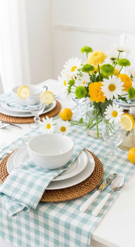 How to achieve it: Pick muted gingham in pale blue, blush, or sage rather than high-contrast checks. Use it only on the napkins or runner, then balance it with plain white plates and simple glassware.