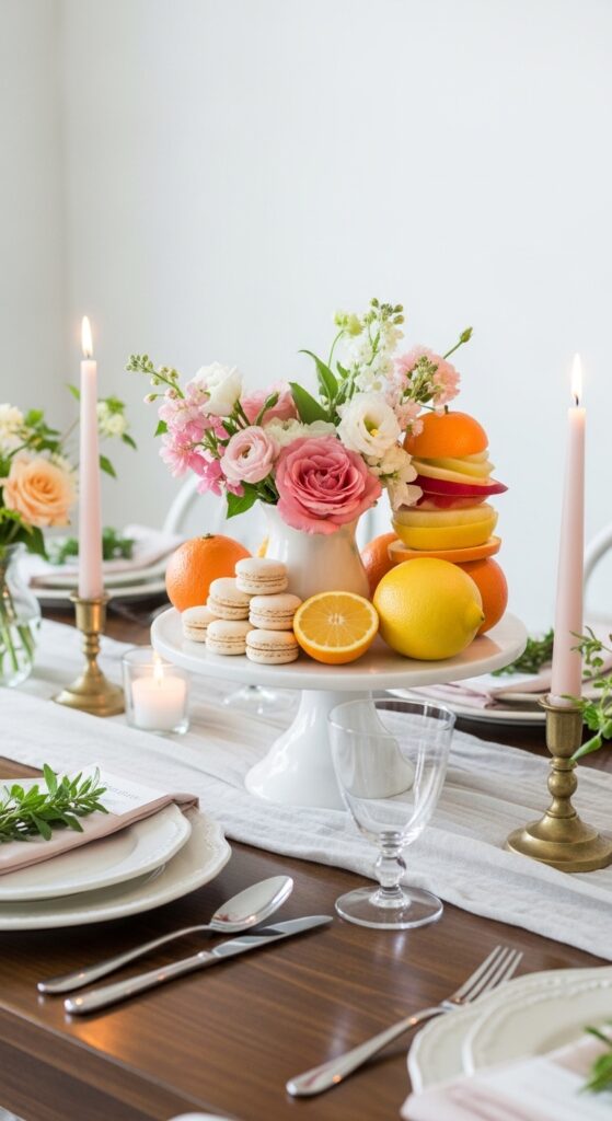 How to achieve it: Use a plain ceramic or marble cake stand and top it with a compact arrangement, macarons, or stacked citrus. Keep it centered and pair it with lower accents nearby so the height transition feels smooth.