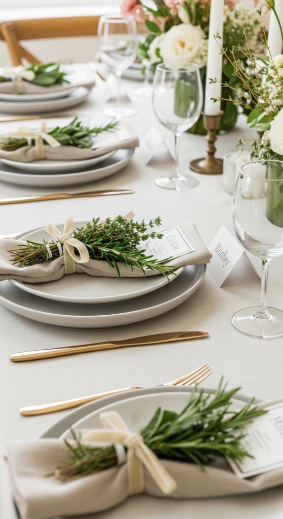 How to achieve it: Tie sprigs of rosemary, thyme, or mint with velvet ribbon or thin twine. This works especially well for elegant Mother’s Day brunch decor because the herbs feel useful, natural, and not overly precious.