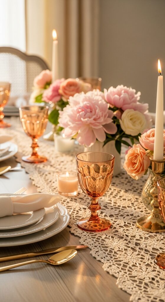 How to achieve it: Choose one glass tone that complements your flowers, like blush with peonies or amber with butter-yellow tulips. If your plates are already patterned, keep the goblets lightly tinted so the table does not feel busy.