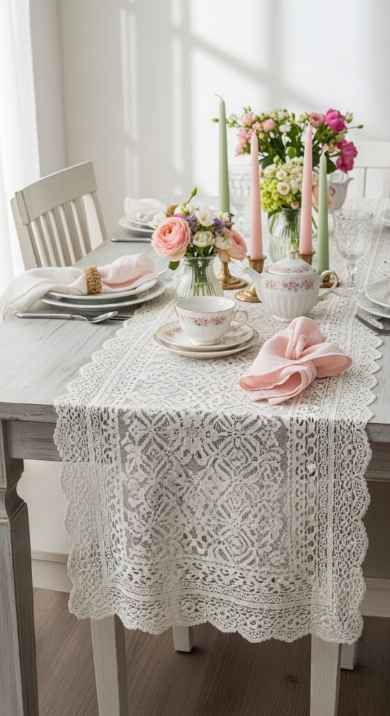 How to achieve it: Use a narrow vintage lace runner over a solid table surface so the detail stays readable. Pair it with simple stoneware and fresh flowers to keep the look updated rather than overly traditional.