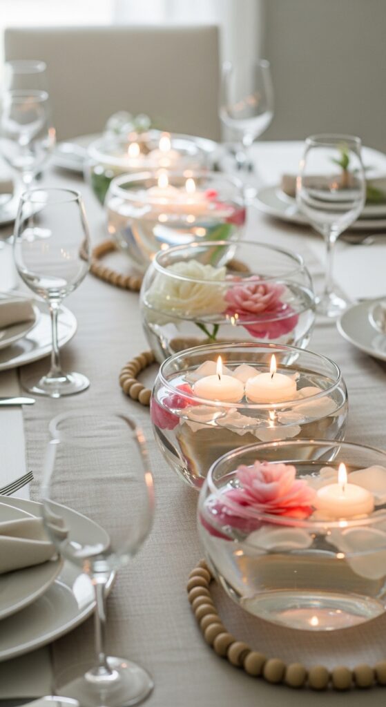 How to achieve it: Use shallow glass bowls or cylinders with floating votives and a few rose petals or camellia blooms. Cluster them in odd numbers so the display looks styled, not lined up too rigidly.