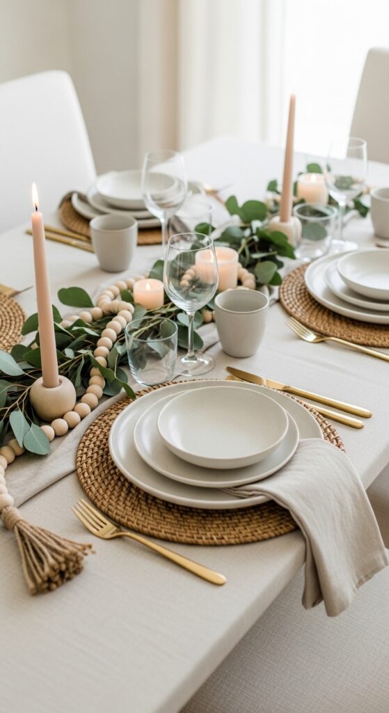 What makes it work: Neutral tables need texture to avoid feeling unfinished. Wood beads, woven placemats, and matte ceramics all catch light differently, which creates quiet depth without relying on strong color.
