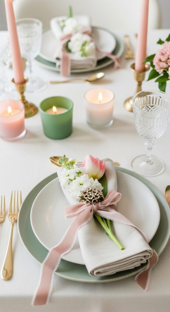 How to achieve it: Use frayed-edge silk or velvet ribbon in blush, cream, or dusty blue, then tuck in one stem of stock, tulip, or wax flower. Tie loosely so the napkin still looks relaxed and touchable.
