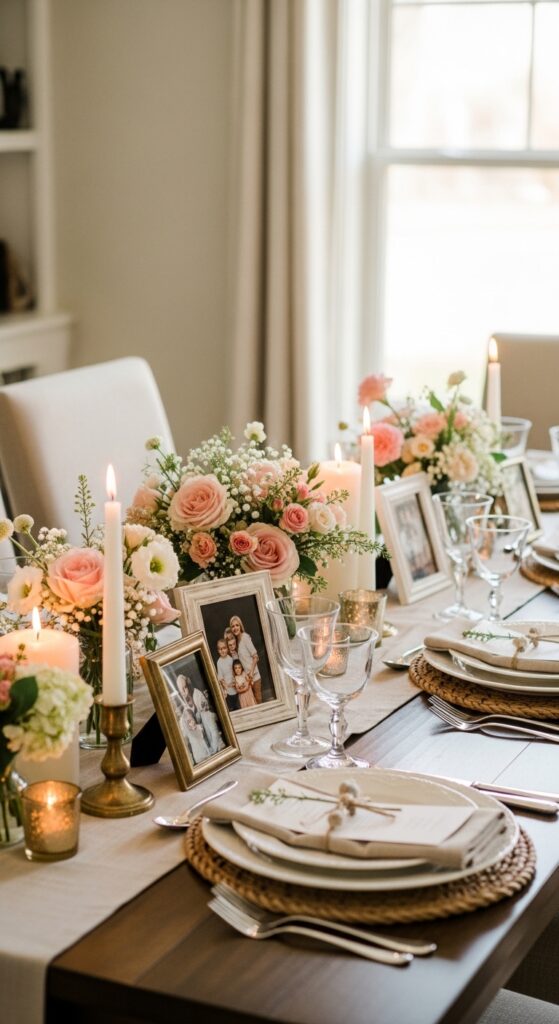 What makes it work: Mother’s Day decor becomes more memorable when it includes story. Small framed photos break up the floral line and add emotional warmth, especially when the rest of the table is kept soft and restrained.