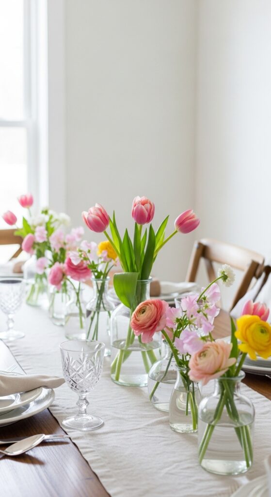 How to achieve it: Mix three vase heights, but keep every stem short and loose. Tulips, ranunculus, and sweet peas work especially well because they bend naturally and give that relaxed spring dining table decor look.