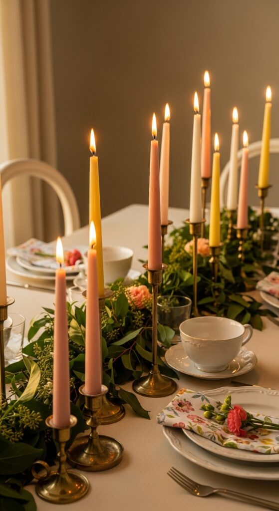 What makes it work: Vertical candle lines add height without visual bulk. Soft pastel tapers echo spring florals, while brass holders ground the look so it feels elegant instead of overly sweet.
