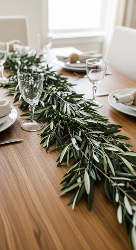 How to achieve it: Use seeded eucalyptus, olive branches, or salal in a loose line rather than a thick rope. Let the branches drape slightly over the edge for a relaxed finish, especially if your dining room gets strong natural light.