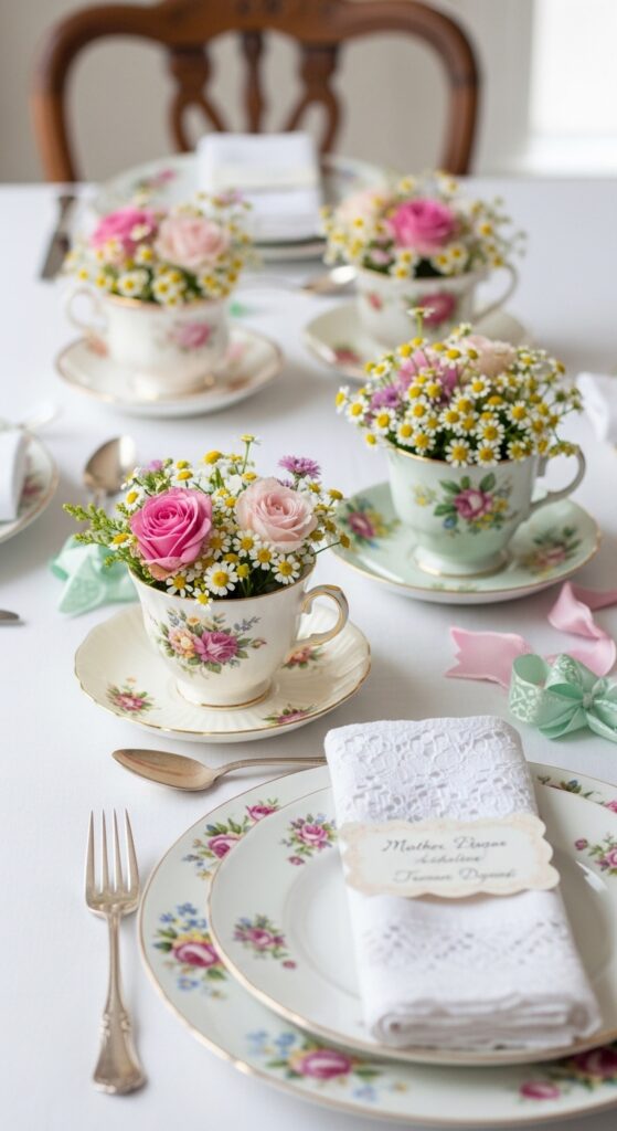 How to achieve it: Fill thrifted teacups with floral foam or a small water tube, then add short stems like spray roses or chamomile. Mix patterns within the same color family so the table feels collected, not chaotic.