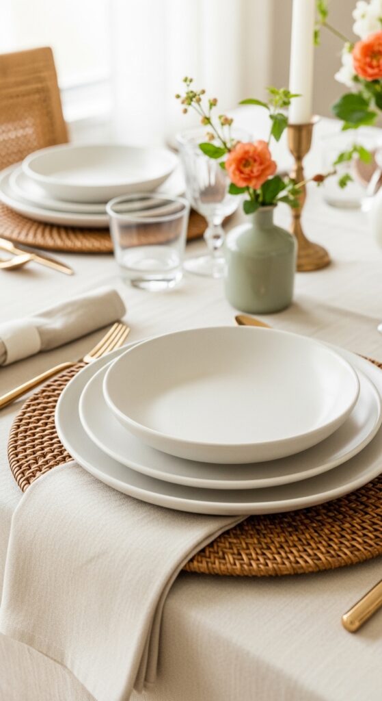 How to achieve it: Pair simple white stoneware with medium-tone woven chargers rather than very dark wicker. This works especially well in casual dining rooms where you want spring tablescape ideas that still feel approachable.