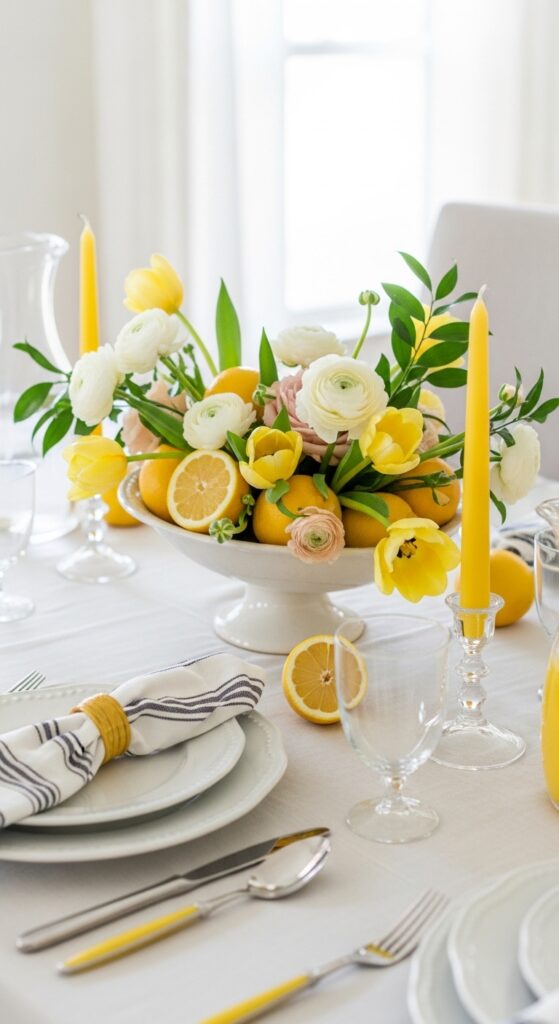 How to achieve it: Fill a low compote or shallow bowl with whole lemons, then tuck in tulips or ranunculus between them. Repeat yellow in one other place, like napkins or taper candles, so the color story feels intentional.