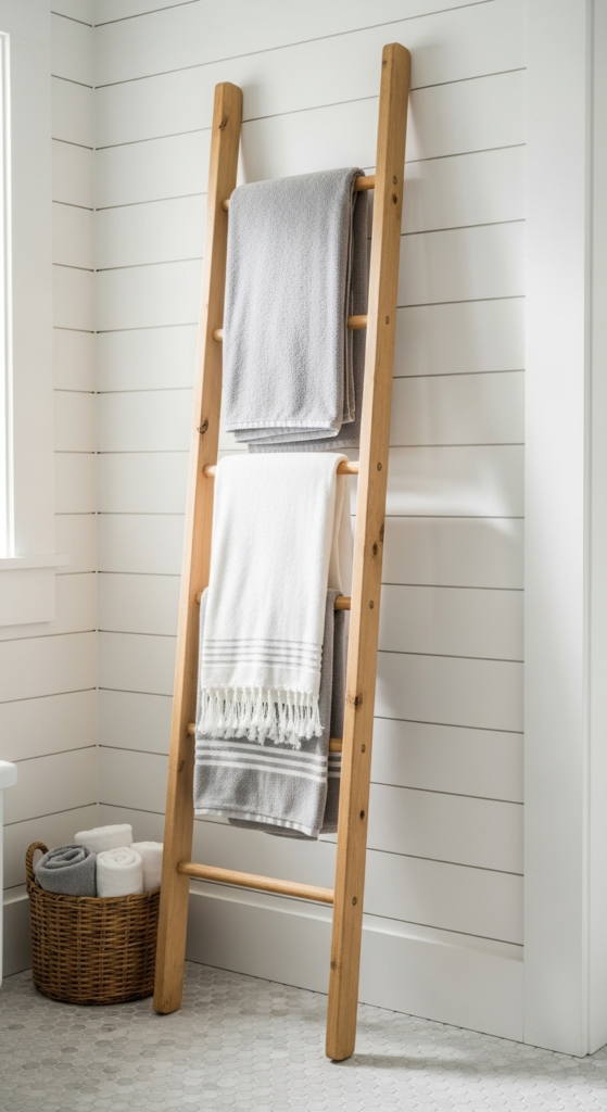 10. Freestanding Wooden Ladder Towel Rack