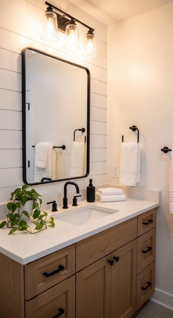 Moody, modern, still very farmhouse. Matte black fixtures sharpen the whole aesthetic instantly.