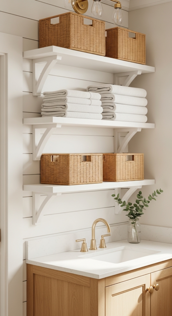Organized, beautiful, and so easy to recreate. Wicker baskets make storage look intentional.