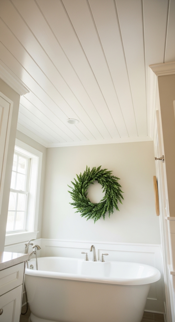 An unexpected detail that changes everything. A wood plank ceiling adds warmth from above.