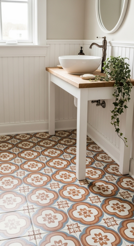 Artful underfoot. A bold cement tile pattern grounds the whole farmhouse bathroom with personality.