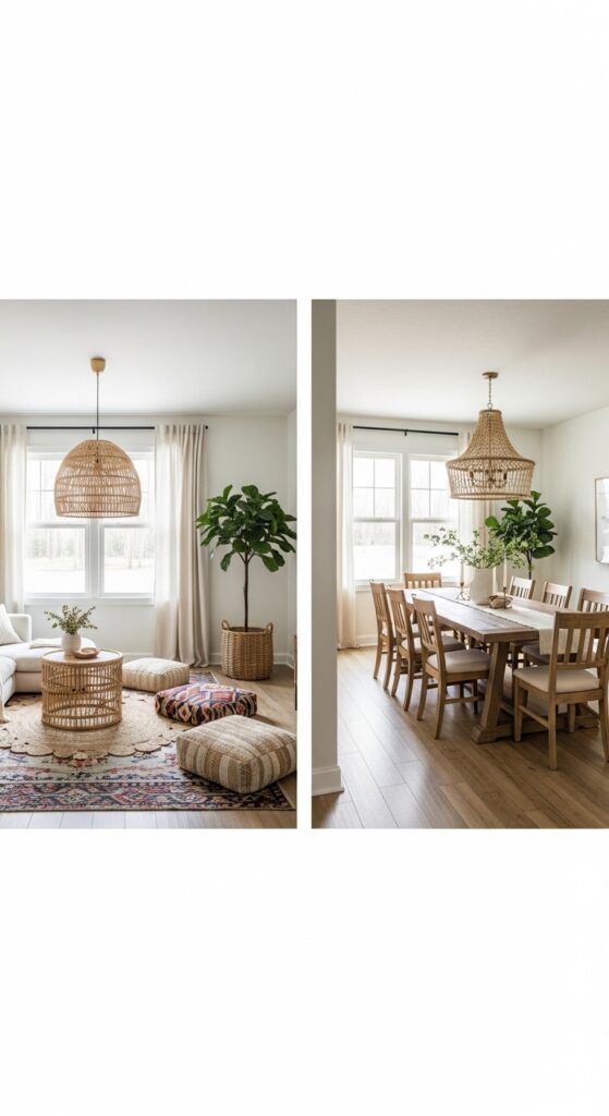 Why it works: In an open floor plan, rugs and pendant lights are the two most powerful zone-defining tools available — they communicate “this area has a specific purpose” without requiring walls or partitions. The key is ensuring both zones share a common thread: same color family, similar material warmth, consistent rug scale. Boho farmhouse is particularly well-suited to open plans because its layered, eclectic nature fills large spaces without making them feel sparse or under-decorated.
