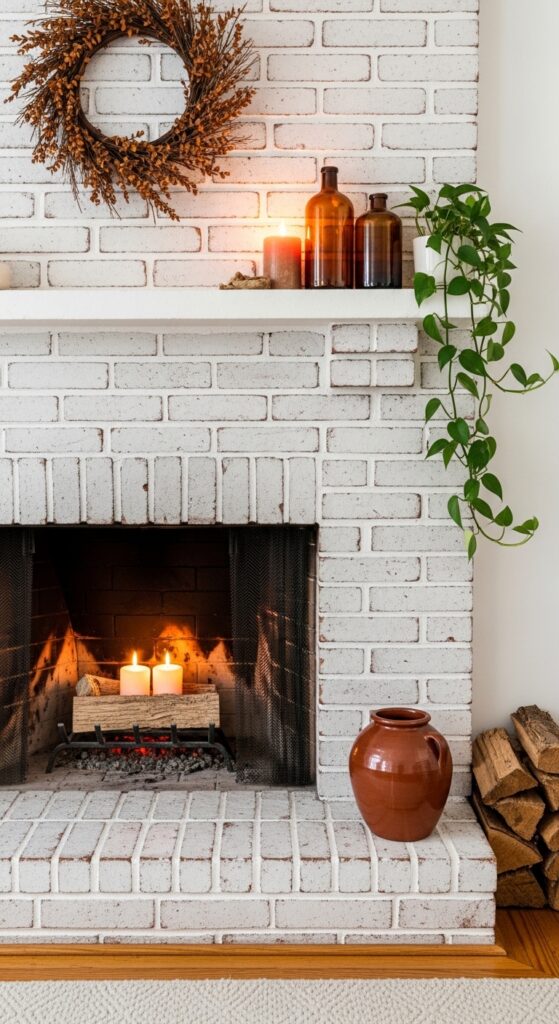 Why it works: Whitewashing brick is a technique that preserves the texture and dimension of the brick while neutralizing its orange-red undertone, which can clash with boho farmhouse’s warmer, earthier palette. The thin wash lets the brick’s natural variation show through — no two bricks read exactly the same, which is central to the style’s love of imperfection. Amber glass accents on the mantle catch firelight in a way that adds warmth without adding clutter.