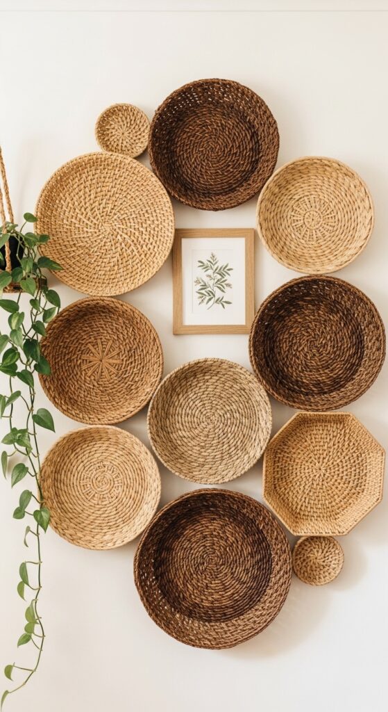 Why it works: A basket gallery wall introduces three-dimensional texture to a vertical surface — it catches light and casts shadows in a way that flat art never does. The varying shapes and weave patterns create visual interest through repetition of a single material category, which is more cohesive than mixing art styles. This technique works on virtually any wall: a hallway, living room, or dining room all benefit from the warmth baskets bring.