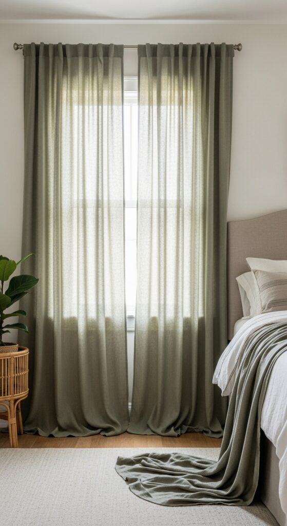 How to get it: Source unlined linen curtains in muted (not bright) sage — H&M Home and IKEA’s DYTÅG line both offer linen-blend panels in earthy greens under $60 per pair. Avoid blackout lining, which kills the diffused-light effect that makes linen curtains magical.