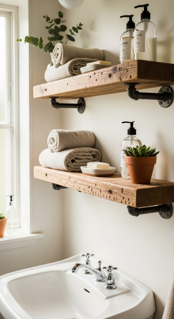 Why it works: Reclaimed pine introduces warmth and history into a bathroom — a space that often defaults to cold tile and chrome. The visible knots and grain variation aren’t flaws; they’re the point. Iron pipe brackets are structurally honest (the support is visible, not hidden) and reinforce the farmhouse industrial edge within the boho aesthetic. In a small bathroom especially, open shelving prevents the visual compression that upper cabinets create.
