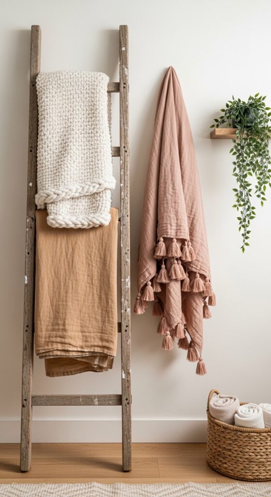 Why it works: A leaning ladder solves an invisible design problem: where do you store throws and extra blankets without hiding them in a closet or piling them on furniture? A ladder displays them as part of the room’s visual composition. The varying lengths of draped textiles create an organic, asymmetric silhouette against the wall — more interesting than a straight vertical line. It also introduces a vertical element into a space that might otherwise be dominated by horizontal furniture.