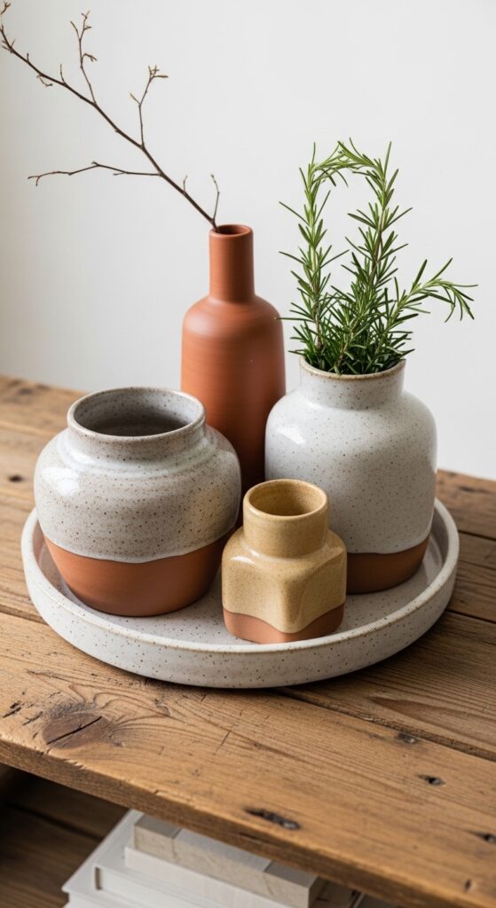 How to get it: Shop ceramics from individual makers on Etsy or local markets — look for pieces with matte or satin finishes rather than glossy glazes, which read more contemporary than rustic. Arrange your group on a natural linen runner or inside a shallow wooden tray to give the vignette a boundary and prevent it from looking random.