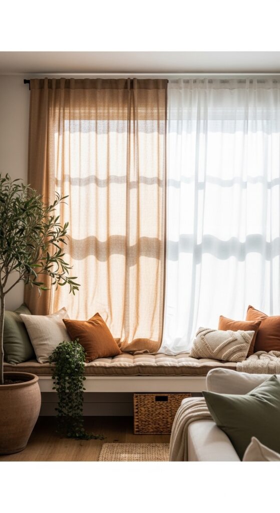 Why it works: Layering two sheer linen panels on a single window creates a diffusion effect that’s significantly warmer and more interesting than a single panel — the light passes through two slightly different weave densities, creating the kind of soft, layered glow that photographers call “magic hour” and decorators call the difference between a good room and a great one. This technique works especially well in south- and west-facing rooms where unfiltered light would otherwise be too intense.