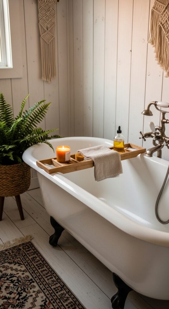 💡 Quick Win: A simple wooden bath caddy ($25–$45 on Amazon or Umbra) transforms even a standard bathtub into a styled moment — place one beeswax candle, one rolled linen washcloth, and one small ceramic dish on it.