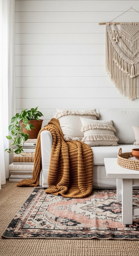 Why it works: Shiplap’s horizontal lines create visual rhythm across the wall, but in warm white (not stark white), it reads rustic rather than nautical. Layering a kilim rug over jute introduces pattern through textile rather than paint — a softer, more forgiving way to add color that can be swapped seasonally. The macramé anchors the boho element without competing with the wall’s texture, because both are light in tone.