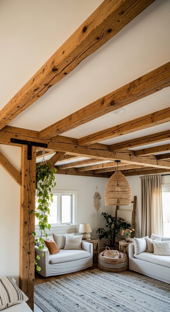 Why it works: Exposed ceiling beams work on the principle of authentic structure made visible — the architecture tells the truth about how the space is built, and that honesty reads as warmth rather than decoration. In boho farmhouse interiors, beams bridge both aesthetics perfectly: they’re the farmhouse’s structural grounding and the boho’s love of raw, natural material. They also draw the eye upward, making rooms feel taller even when the beams themselves reduce the visible ceiling height slightly.