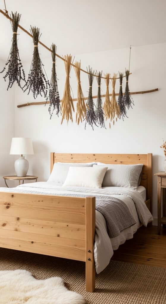 How to get it: Mount a raw wooden dowel or a simple curtain rod parallel to the wall, 12–18 inches above the headboard. Bundle dried stems with natural twine and hang them from the rod with a simple overhand knot, staggering lengths slightly. Dried bundles from Michael’s or a local florist market cost $6–$14 per bundle — five bundles is enough for a full visual effect.
