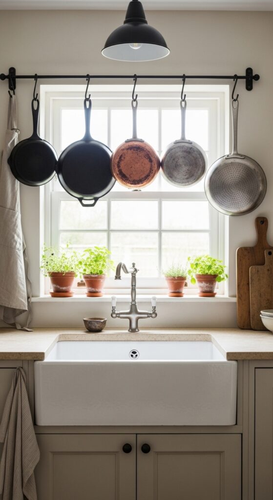 Why it works: Hanging cookware turns everyday tools into decorative elements — a farmhouse move that’s entirely practical. Cast iron, copper, and steel have naturally warm, varied patinas that function as metallic accents without requiring separate decorative pieces. The visual weight of hanging cookware above a farmhouse sink also creates a focal point on what is often the most visually prominent wall in a kitchen: the window-above-sink wall.