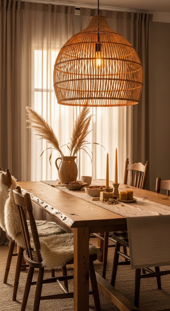 Why it works: Rattan’s open weave diffuses light rather than blocking it, creating a dappled, organic glow that no glass or metal pendant can replicate. When hung low over a reclaimed wood table — ideally 30–34 inches above the surface — the pendant creates an intimate pool of warmth that draws people inward. The natural tones of the rattan and the wood exist on the same warm-honey spectrum, so they harmonize without matchy-matching.